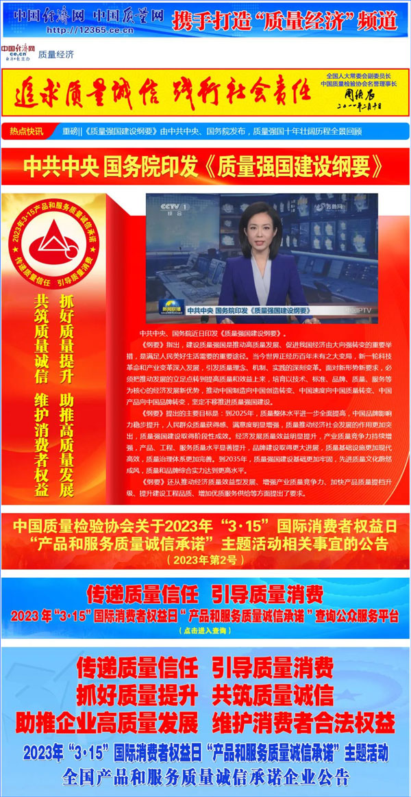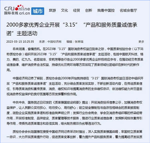 中國(guó)經(jīng)濟(jì)網(wǎng):2000多家優(yōu)秀企業(yè)開(kāi)展“3·15”“產(chǎn)品和服務(wù)質(zhì)量誠(chéng)信承諾”主題活動(dòng)
