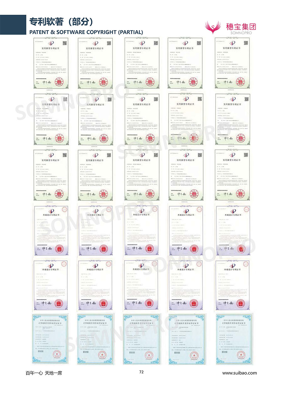 穗寶集團(tuán)遍訪全球,深度整合世界優(yōu)質(zhì)資源,專注睡眠研究,與世界家具材料行業(yè)領(lǐng)導(dǎo)者禮恩派集團(tuán)結(jié)成戰(zhàn)略伙伴,成立睡眠研究中心和彈簧網(wǎng)檢測中心,引入床墊鋪面耐久性測試儀,材料拉力測試儀,床墊撓度曲線測試儀,為產(chǎn)品注入優(yōu)秀基因;成功研發(fā)推出IFEEL深睡感知系統(tǒng)、X7研發(fā)系統(tǒng),關(guān)注消費(fèi)者每一個細(xì)微的睡眠需求,致力于以科學(xué)的方式創(chuàng)造優(yōu)異的物理與心理助眠條件,幫助現(xiàn)代人獲得優(yōu)質(zhì)深度睡眠;不斷創(chuàng)新進(jìn)取,軀位步技術(shù)、T-GUARD衡力支承系統(tǒng)等多項成果獲國內(nèi)國際專利。