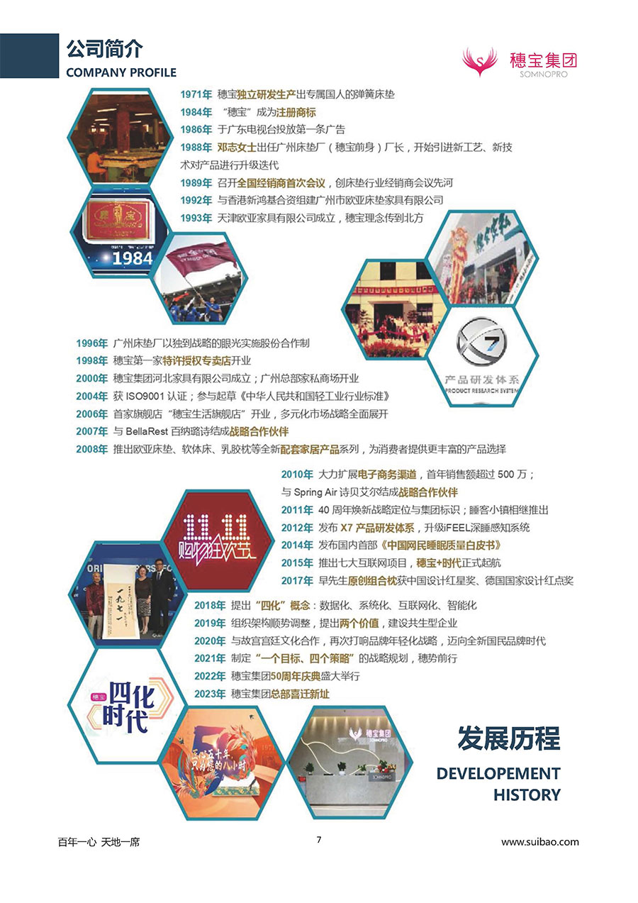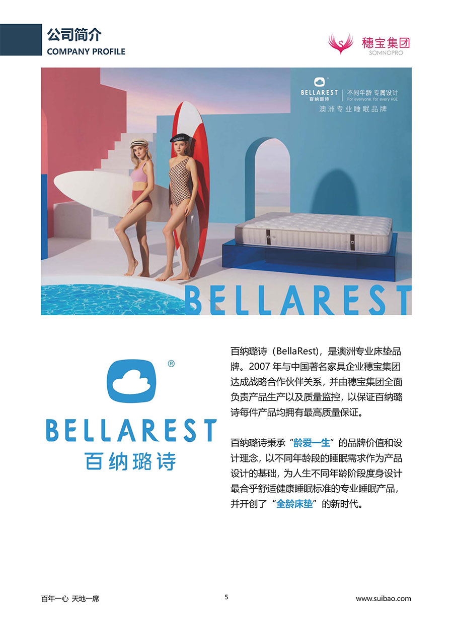 作為大家居行業(yè)的品質(zhì)倡導(dǎo)者,穗寶集團(tuán)不斷創(chuàng)新,豐富品牌實力,致力推動中國床墊產(chǎn)業(yè)發(fā)展。至今,穗寶集團(tuán)旗下?lián)碛卸鄠€來自世界各地的優(yōu)質(zhì)品牌,包括:穗寶、詩貝艾爾、百納璐詩、睡客小鎮(zhèn)、Mr.Z早先生等;此外,穗寶集團(tuán)從世界各地甄選適合不同消費(fèi)者的優(yōu)質(zhì)睡眠產(chǎn)品,定制屬于您的睡眠空間。如今,穗寶集團(tuán)形成以研發(fā)、生產(chǎn)和銷售床墊為主營業(yè)務(wù),涉及家具、家居裝飾、酒店配套等多項業(yè)務(wù)的企業(yè)群體。