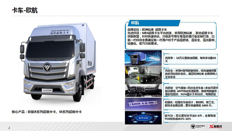 北汽福田汽車股份有限公司(簡稱福田汽車)成立于1996年,1998年在上海證券交易所上市,是中國品種最全、規(guī)模最大的商用車企業(yè)之一,2021年品牌價(jià)值達(dá)1808.36億元,連續(xù)16年蟬聯(lián)中國商用車行業(yè)第一位。2021年,在福田汽車成立的第25周年,總銷量突破1000萬輛,成為中國汽車工業(yè)史上首個(gè)銷量突破千萬輛的商用車企、中國首個(gè)千萬級(jí)“雙自主”商用車企、全球突破千萬銷量用時(shí)最短的商用車企。海外累計(jì)出口65萬輛,連續(xù)10年位居中國商用車出口第一,產(chǎn)品覆蓋全球110個(gè)國家和地區(qū)。