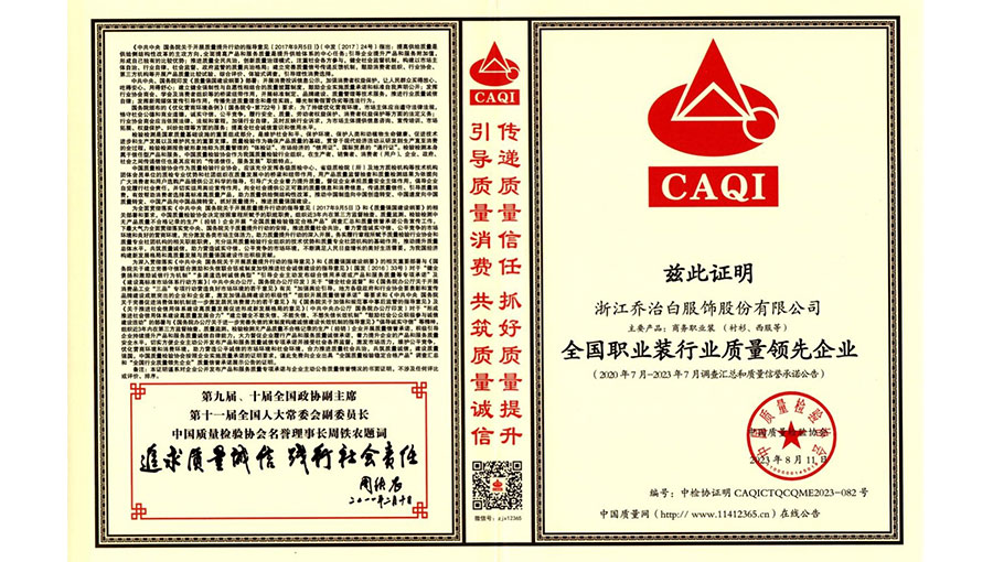 喬治白先后榮獲中國名牌產(chǎn)品、中國職業(yè)裝十大領(lǐng)軍企業(yè)、全國守合同重信用單位、國家級綠色工廠、浙江省智能工廠等榮譽(yù)稱號。作為全國標(biāo)準(zhǔn)化工作先進(jìn)單位,喬治白積極參與標(biāo)準(zhǔn)化工作,先后參與《職業(yè)裝檢驗(yàn)規(guī)則》、《襯衫》、《女西服、大衣》等9項(xiàng)國家標(biāo)準(zhǔn)的起草與修訂工作,《全毛襯西服》行業(yè)標(biāo)準(zhǔn)起草。