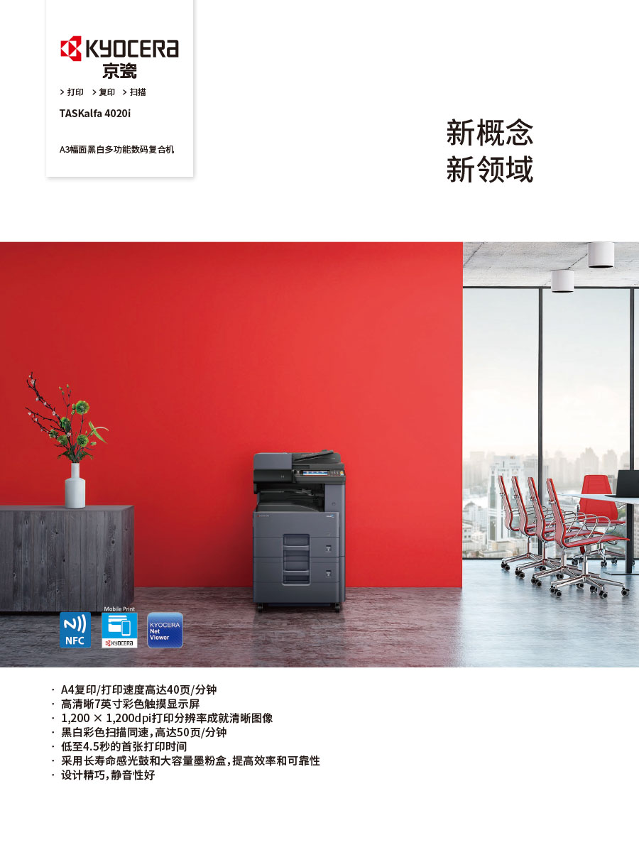 京瓷辦公信息系統(tǒng)(中國)有限公司主要負責彩色和黑白數碼復合機、彩色和黑白數碼激光打印機、生產型彩色噴墨印刷系統(tǒng)、辦公解決方案等系列辦公自動化設備的銷售。京瓷辦公設備將一如既往延續(xù)ECOSYS理念,始終站在時代前沿,以科技服務社會,堅持開發(fā)更能滿足時代需求、更為綠色的新銳產品,使用戶都能夠從中獲得更大的利益。