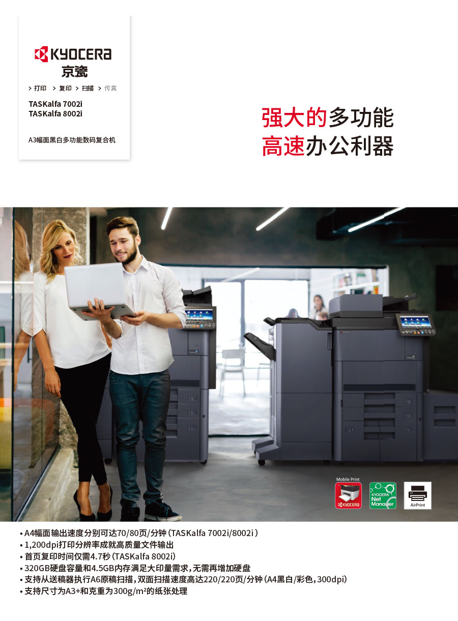 主要產品:KYOCERA京瓷激光打印機,一體機,復合機,生產型彩色噴墨數碼印刷系統(tǒng)及辦公信息系統(tǒng)的開發(fā)、設計、系統(tǒng)集成