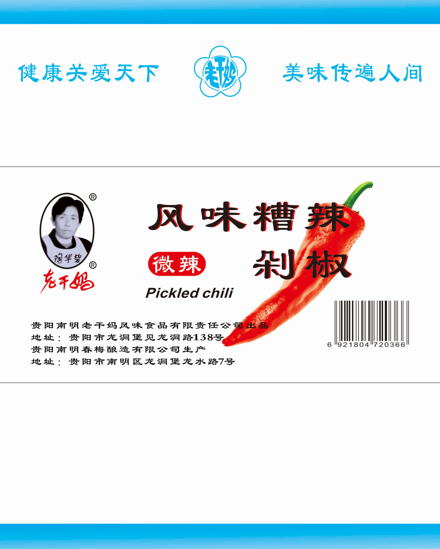 主要產(chǎn)品:老干媽牌油辣椒系列(油辣椒、風(fēng)味豆豉、香菇、精制牛肉末豆豉、辣三丁、香辣脆、干煸肉絲、風(fēng)味雞、肉絲豆豉)、火鍋底料(糟辣椒/植物油)、香辣醬、下飯菜、拌飯醬、風(fēng)味水豆豉、紅油腐乳、風(fēng)味腐乳、香辣菜、風(fēng)味糟辣剁椒(中辣/微辣)、姜蒜糟辣剁椒、番茄辣醬