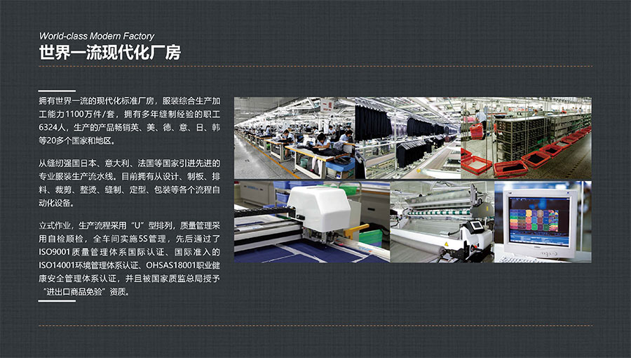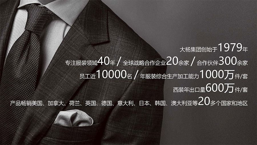 多年來(lái),大楊集團(tuán)深耕主業(yè)、堅(jiān)守實(shí)業(yè),積極開(kāi)拓國(guó)內(nèi)外高端服裝市場(chǎng),年服裝綜合生產(chǎn)加工能力1100萬(wàn)件/套,其中年定制服裝生產(chǎn)數(shù)量穩(wěn)居全球第一。年西服出口量600萬(wàn)件/套,連續(xù)多年排名全國(guó)第一。先后被評(píng)為世界服裝行業(yè)五百?gòu)?qiáng)企業(yè)、全國(guó)服裝行業(yè)十強(qiáng)/百?gòu)?qiáng)企業(yè)、國(guó)家重點(diǎn)扶持的中國(guó)名牌出口企業(yè)、國(guó)家級(jí)重合同守信譽(yù)單位、國(guó)家級(jí)服務(wù)型制造示范企業(yè)、國(guó)家重點(diǎn)培育紡織服裝百家品牌、遼寧省數(shù)字化轉(zhuǎn)型標(biāo)桿企業(yè),榮獲全國(guó)五一勞動(dòng)獎(jiǎng)狀、全國(guó)文明單位、全國(guó)紡織行業(yè)先進(jìn)集體、全國(guó)抗擊新冠肺炎疫情先進(jìn)民營(yíng)企業(yè)、省長(zhǎng)質(zhì)量獎(jiǎng)等稱號(hào),入選“中國(guó)服裝智能制造技術(shù)創(chuàng)新戰(zhàn)略聯(lián)盟”創(chuàng)始會(huì)員。同時(shí),大楊集團(tuán)還在同行業(yè)中率先通過(guò)“AAA級(jí)兩化融合管理體系”評(píng)定,以及ISO9001質(zhì)量管理體系國(guó)際認(rèn)證、國(guó)際準(zhǔn)入的ISO14001環(huán)境管理體系認(rèn)證、ISO45001職業(yè)健康安全管理體系認(rèn)證。