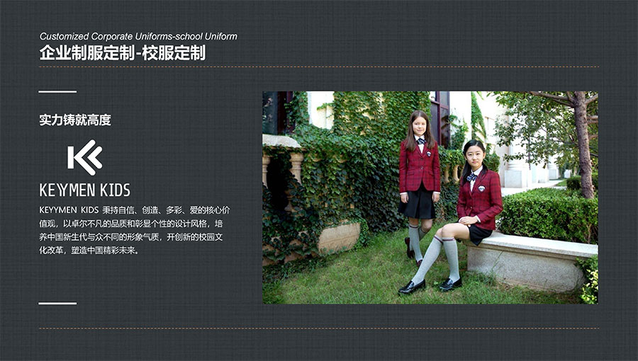 凱門(mén)學(xué)生裝(KEYYMEN KIDS)秉持自信、創(chuàng)造、多彩、愛(ài)的核心價(jià)值觀,堅(jiān)持“領(lǐng)先一步,步步領(lǐng)先”的品牌理念,致力于打造最具影響力的學(xué)生裝品牌,為中國(guó)青少年形象代言,以卓爾不凡的品質(zhì)和彰顯個(gè)性的設(shè)計(jì)風(fēng)格,培養(yǎng)中國(guó)青少年與眾不同的形象氣質(zhì)。