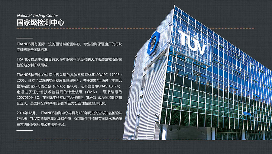 大楊集團(tuán)堅(jiān)持自主創(chuàng)新,聘請(qǐng)意大利、日本、美國(guó)等資深專(zhuān)家,組建具備世界領(lǐng)先水平的技術(shù)研發(fā)團(tuán)隊(duì),尤其是自主研發(fā)的全毛芯、全手縫等多項(xiàng)核心技術(shù),確立了企業(yè)在世界服裝行業(yè)的領(lǐng)先地位。目前,大楊集團(tuán)擁有6家高新技術(shù)企業(yè),1家瞪羚企業(yè)、2家專(zhuān)精特新企業(yè)和1個(gè)國(guó)家級(jí)工業(yè)設(shè)計(jì)中心,1個(gè)省級(jí)企業(yè)技術(shù)中心,1個(gè)市級(jí)科技創(chuàng)新服務(wù)機(jī)構(gòu),是中國(guó)服裝產(chǎn)品創(chuàng)新基地、遼寧省標(biāo)準(zhǔn)化示范基地。旗下遼寧科諾檢驗(yàn)檢測(cè)中心,已躋身國(guó)家中小企業(yè)公共服務(wù)示范平臺(tái),獲得CNAS國(guó)家實(shí)驗(yàn)室認(rèn)可、CMA資質(zhì)認(rèn)定,是全國(guó)紡織品標(biāo)準(zhǔn)化技術(shù)委員會(huì)“紡織標(biāo)準(zhǔn)驗(yàn)證實(shí)驗(yàn)室”,擁有500余項(xiàng)紡織類(lèi)檢測(cè)標(biāo)準(zhǔn)能力,已累計(jì)主持或參與制定國(guó)家標(biāo)準(zhǔn),以及制定各類(lèi)企業(yè)標(biāo)準(zhǔn)30多項(xiàng)。