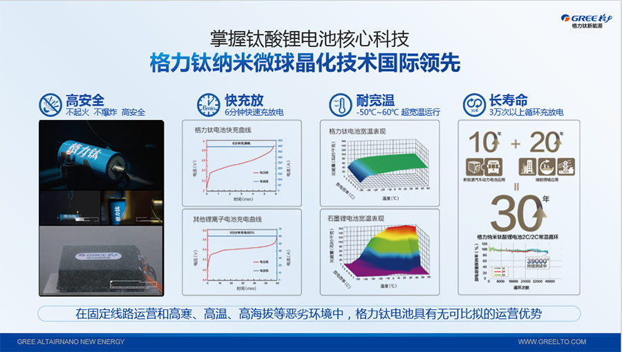 鈦酸鋰電池技術(shù)是新能源行業(yè)唯一獲得中國(guó)專利獎(jiǎng)金獎(jiǎng)的鋰電池產(chǎn)品技術(shù),其應(yīng)用于儲(chǔ)能電池和動(dòng)力電池具有超高安全性,在快充放、耐寬溫、長(zhǎng)壽命等方面同樣具有卓越的性能。格力鈦電池系列產(chǎn)品具有不起火不爆炸高安全、6分鐘快充放、-50℃至60℃耐寬溫特性,循環(huán)充放電次數(shù)高達(dá)30000多次,使用壽命長(zhǎng)達(dá)30年。格力鈦電池經(jīng)利鋸切割、尖針穿刺、強(qiáng)力擠壓、電鉆沖孔、短路充放電、高溫加熱、槍擊等極限條件測(cè)試,均未發(fā)生冒煙、起火、燃燒、爆炸等現(xiàn)象。