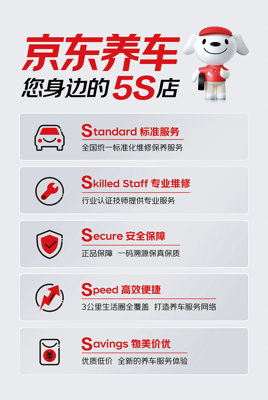 在養(yǎng)車標準方面京東養(yǎng)車秉承有保障、更專業(yè)的品牌服務理念,推出全新5S服務標準。從多個維度保障客戶權(quán)益,提升服務品質(zhì)。