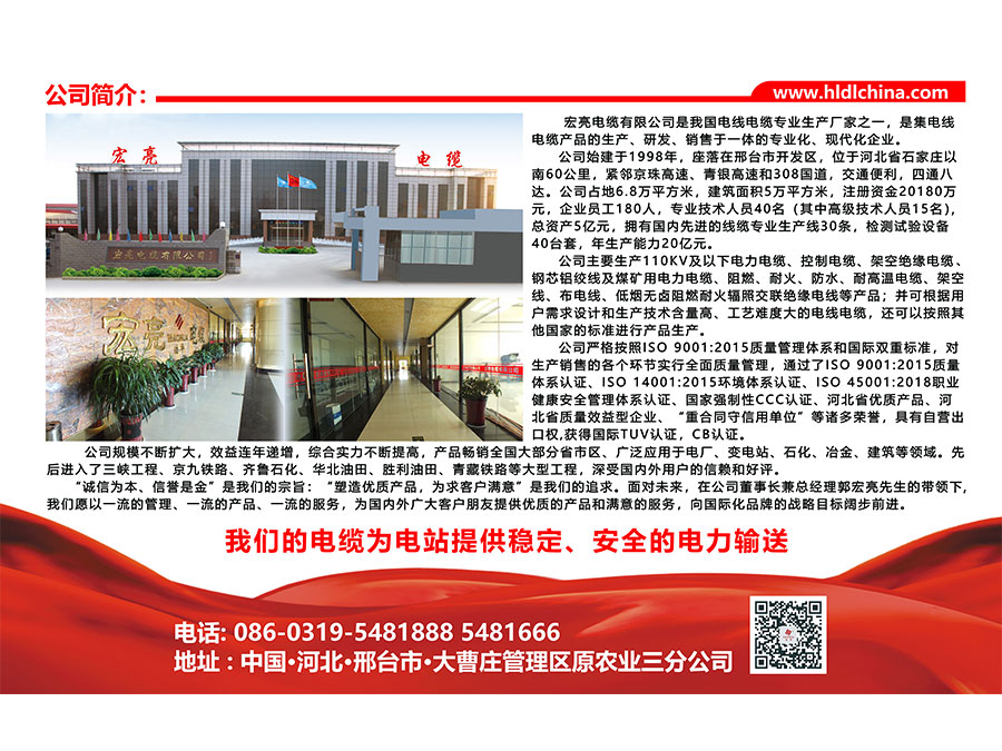 宏亮電纜有限公司是我國電線電纜專業(yè)生產(chǎn)廠家之一,是集電線電纜產(chǎn)品的生產(chǎn)、研發(fā)、銷售于一體的專業(yè)化、現(xiàn)代化企業(yè)。宏亮電纜始建于1988年,坐落在邢臺(tái)市開發(fā)區(qū),位于河北省石家莊以南60公里,緊鄰京珠高速、青銀高速和308國道,四通八達(dá)。