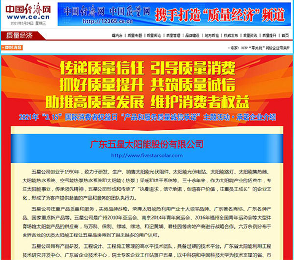 近日,在中國(guó)質(zhì)量檢驗(yàn)協(xié)會(huì)舉辦的2021年“3·15”國(guó)際消費(fèi)者權(quán)益日“產(chǎn)品和服務(wù)質(zhì)量誠(chéng)信承諾”主題活動(dòng)中,五星公司憑借一貫穩(wěn)定的產(chǎn)品質(zhì)量和優(yōu)良服務(wù)的口碑,被評(píng)為全國(guó)產(chǎn)品和服務(wù)質(zhì)量誠(chéng)信示范企業(yè);五星品牌下的五星光伏電站、太陽(yáng)能(熱泵)熱水系統(tǒng),從眾多企業(yè)中脫穎而出,被評(píng)為全國(guó)質(zhì)量檢驗(yàn)穩(wěn)定合格產(chǎn)品。