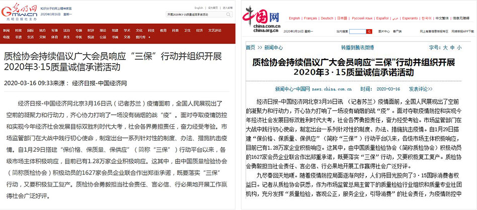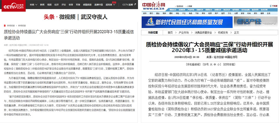 中國經(jīng)濟網(wǎng)《質檢協(xié)會持續(xù)倡議廣大會員響應“三保”行動并組織開展2020年3·15質量誠信承諾活動》