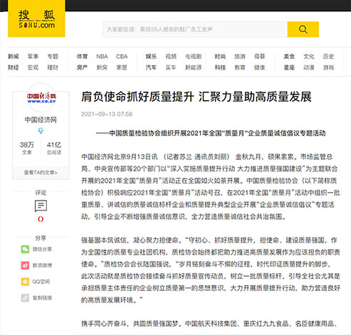 搜狐網(wǎng):肩負(fù)使命抓好質(zhì)量提升 匯聚力量助高質(zhì)量發(fā)展——中國質(zhì)量檢驗(yàn)協(xié)會(huì)組織開展2021年全國“質(zhì)量月”企業(yè)質(zhì)量誠信倡議專題活動(dòng)