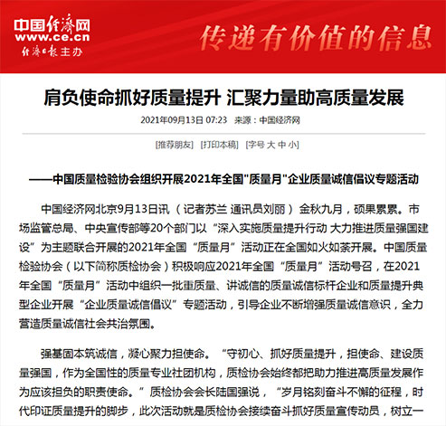 中國經(jīng)濟(jì)網(wǎng):堅(jiān)持質(zhì)量第一 抓好質(zhì)量提升 共筑質(zhì)量誠信 建設(shè)質(zhì)量強(qiáng)國——2021年全國“質(zhì)量月”企業(yè)質(zhì)量誠信倡議書